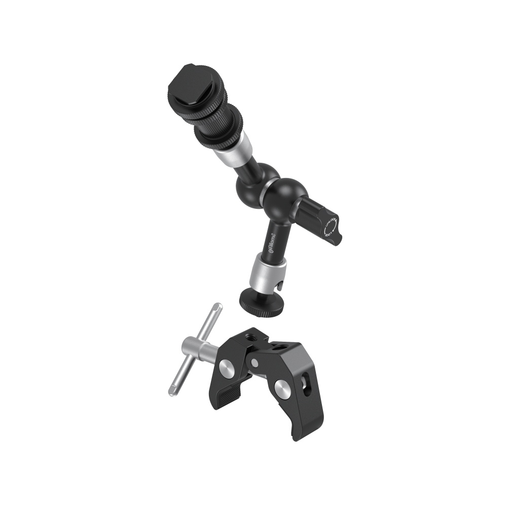 SmallRig Crab-Shaped Clamp & Magic Arm (11”) with Cold Shoe 3726 consists of a crab-shaped clamp and a magic arm (11″). It is made of aluminum alloy and stainless steel to increase robustness and durability. Particularly, the clamp features 1/4″-20 and 3/8″-16 threads and maximum/minimum open distance of 54mm and 15mm; the magic arm has a 1/4″-20 screw at one end and a cold shoe at the other, allowing being mounted onto such accessories as a cage, LED light, microphone, monitor, as well as double ball heads that enable 360-degree adjustment as needed. The magic arm together with the clamp quickly connects cameras, monitors, lights and other equipment with pipe posts, tables, bike bars, etc. Both the clamp and the magic arm are fitted with rubber pads to prevent scratches and help lock equipment in place.