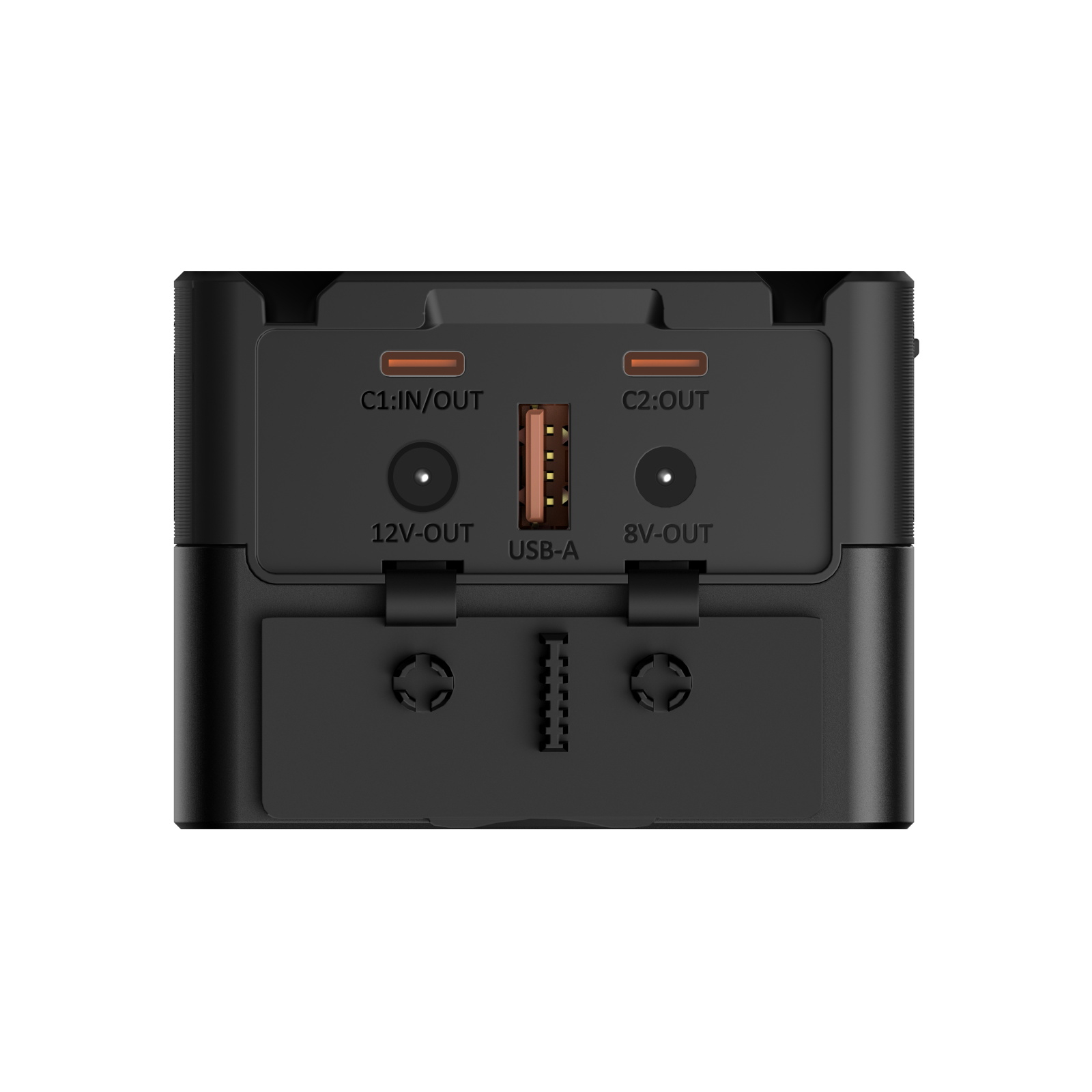 4. Interfaces: 2 USB-C, 1 D-Tap, 1 USB-A, 1 8V-OUT, 1 12V-OUT, each with a shunt design to allow simultaneous USB-C and USB-A fast charging.